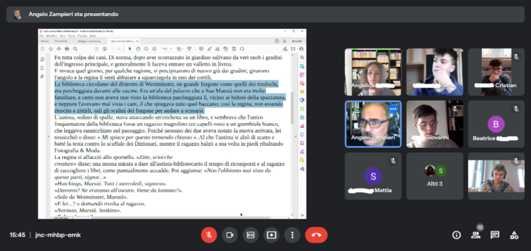 Abbiamo approfittato della presenza di Mele, oggi nostro ospite in videoconferenza, per farci leggere da lui l’incipit del brano su cui abbiamo poi lavorato per farne lettura espressiva, tratto da La Sovrana lettrice di Alan Bennett. Ci siamo soffermati a valutare, in particolar modo, la fluidità e la calma da lui impressa nella lettura.
