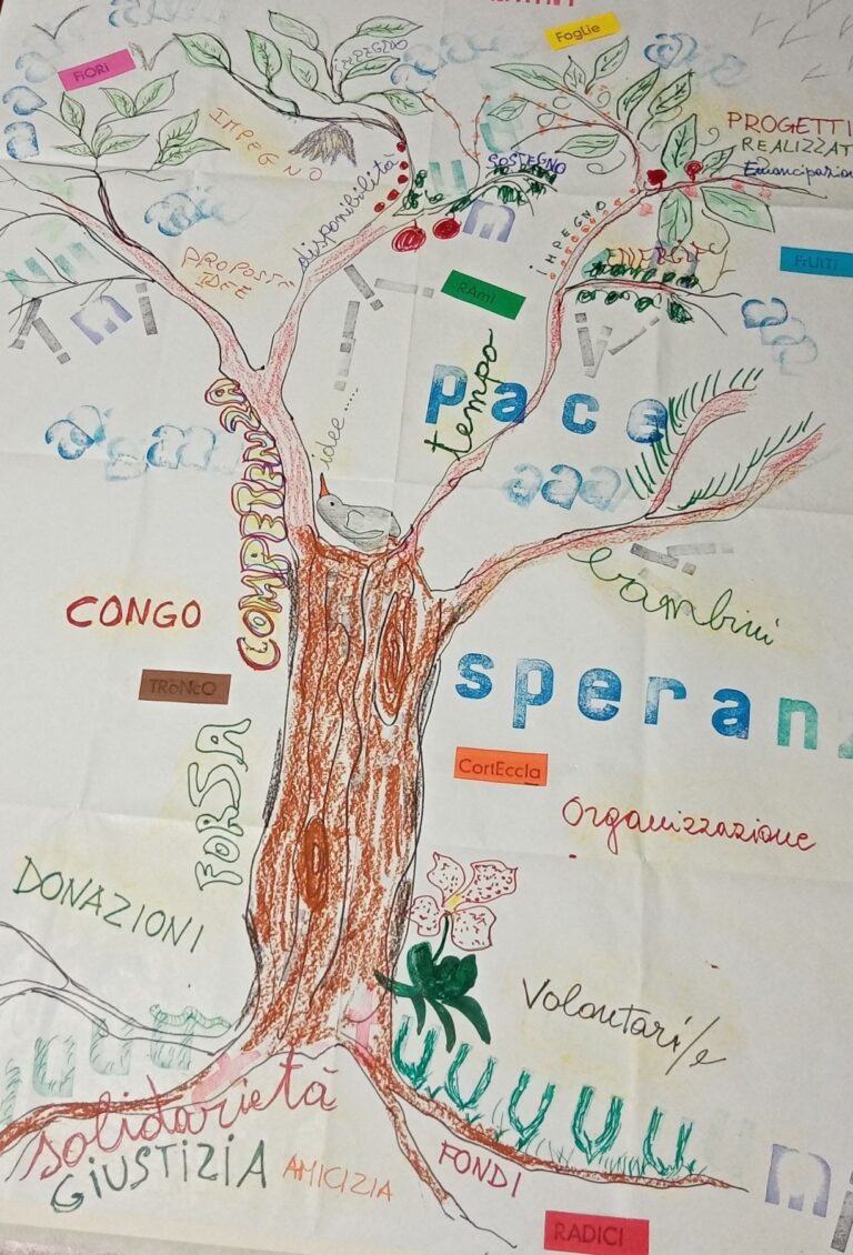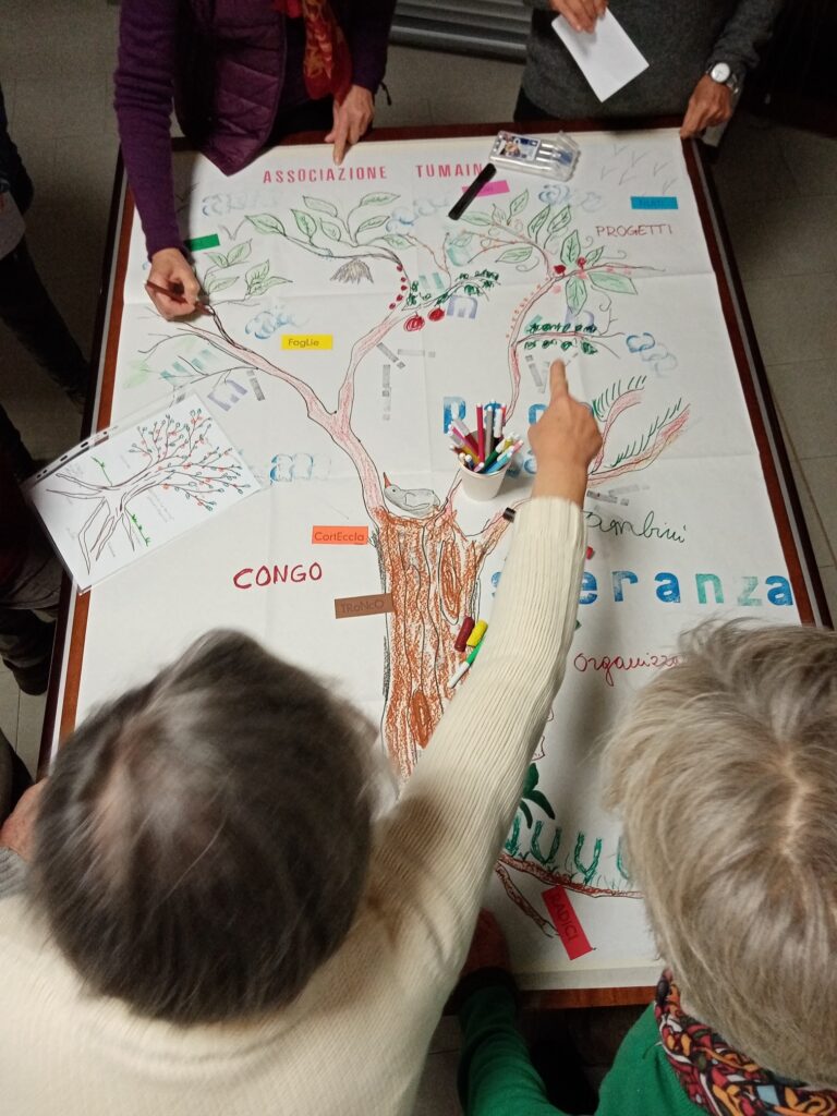Dopo questa prima fase di riscaldamento, passiamo a lavorare sul senso del nostro essere parte di un’associazione (in questo caso Tumaini) e sulle nuove direzioni o stimoli che stiamo cercando. Partiamo dalle riflessioni già iniziate il 30 Ottobre durante il primo incontro rivolto ai volontari, in cui ognuno aveva disegnato il proprio piccolo albero in cui aveva avuto la possibilità di scrivere ciò che significavano radici, rami, foglie, frutti, semi. Le domande con cui provochiamo la riflessione odierna, danno ad ognuno il modo per rielaborare il proprio punto di vista. Ci ritroviamo dunque in gruppo e creiamo un grande albero che si compone delle risposte e degli spunti che ognuno ha trovato. Eccolo qui sotto.