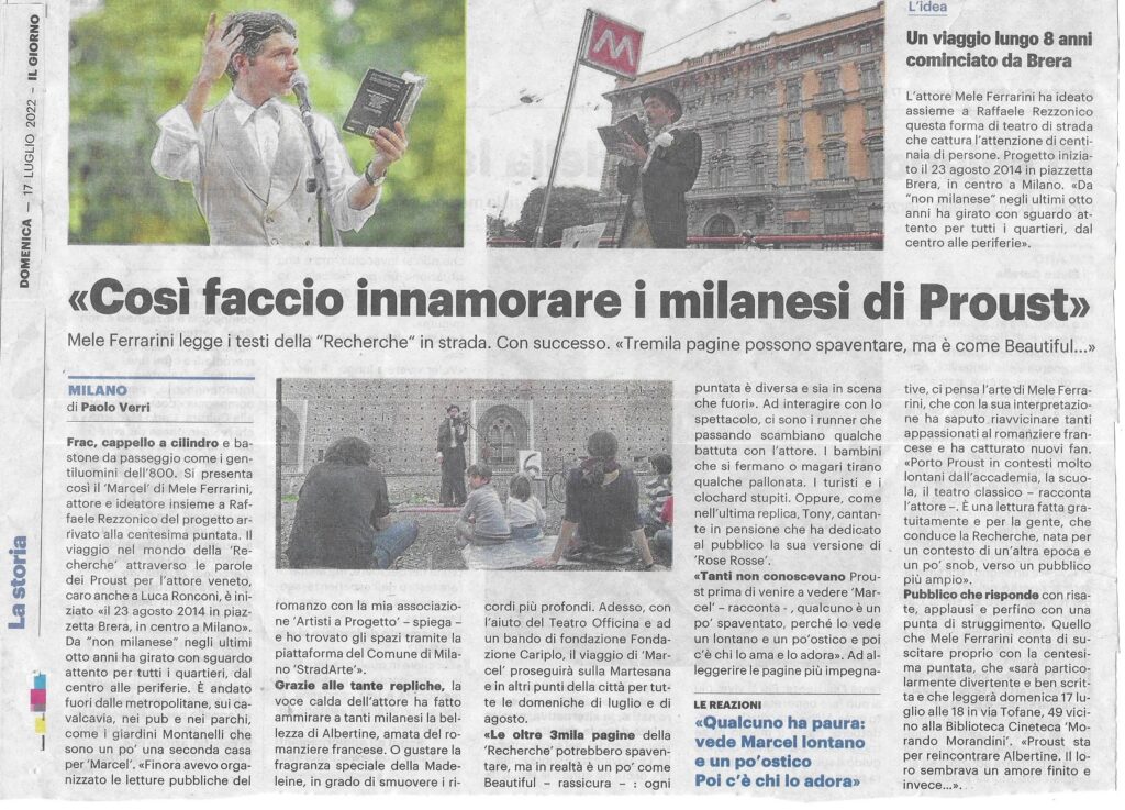 “Quando ho deciso di venire a vivere a Milano non ne conoscevo ancora l’ambiente teatrale. Dunque, l’idea che abbiamo avuto, io e Raffaele, è stata quella di attingere dal mio libro preferito, un libro che era molto amato anche dai miei genitori, nella casa in cui sono cresciuto. Ho pensato dunque di leggere integralmente a tutti i passanti la Recherche, per condividerne la bellezza, per arrestare il tempo, per godere del presente, senza fretta.
