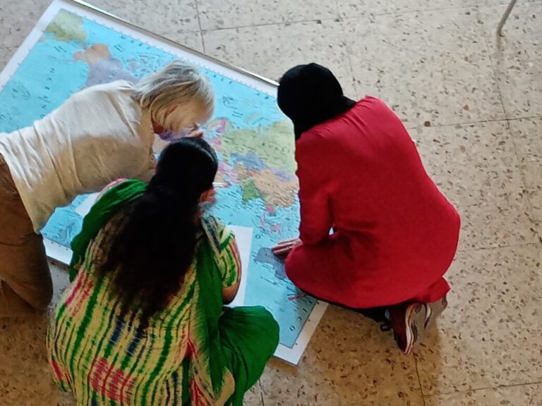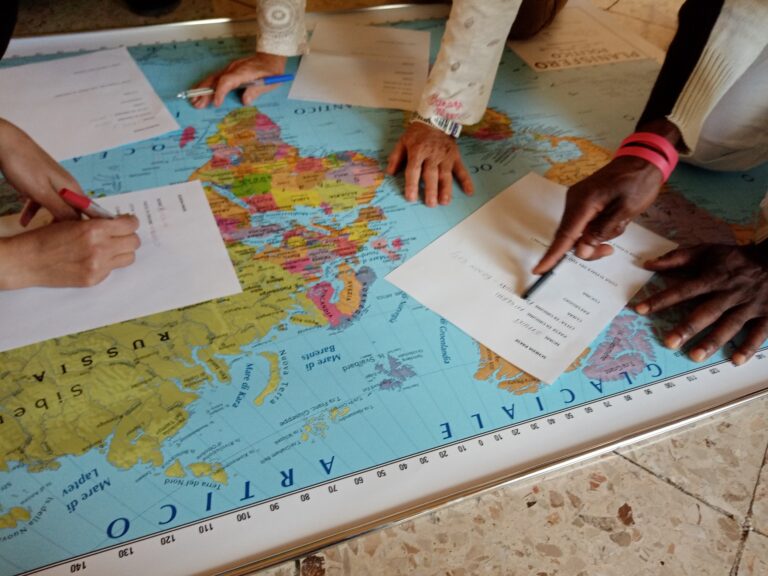 A ognuno diamo un foglio su cui scrivere il proprio nome, paese e città di origine, cibo preferito, un aspetto preferito del paese da cui provengono e anche dell’Italia. Dopodiché apriamo una grande mappa del mondo su cui ognuno è invitato a posizionare il proprio nome stampato da Paola con i timbri su di un biglietto azzurro.